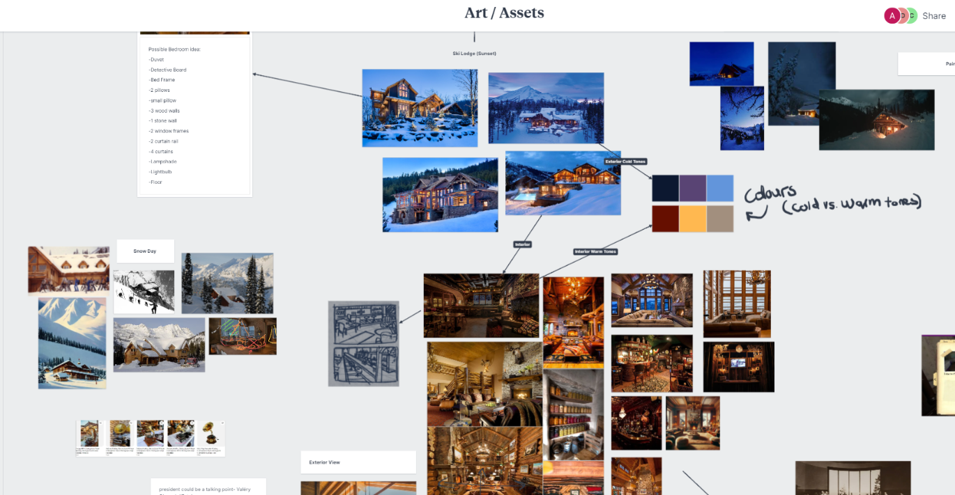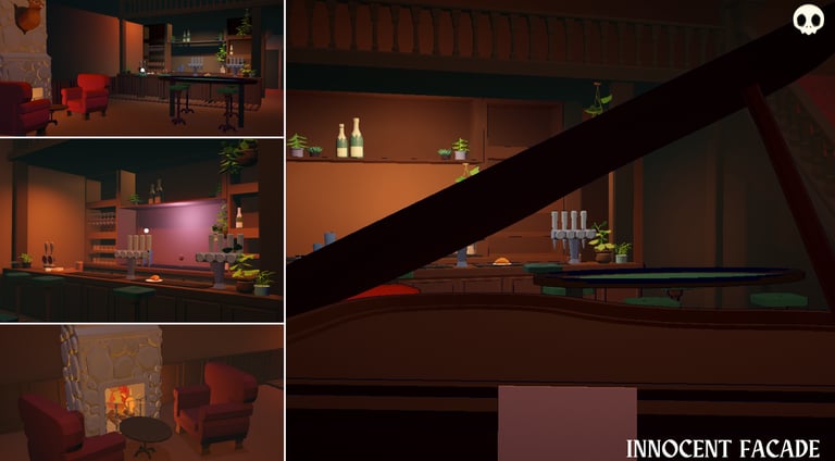The Environment? A Ski Lodge set in the 1970s and built in the 1920s- a retreat for the wealthy and Mr. Bordeaux's private domain, echoing luxury with its grand wooden beams, roaring fireplaces, and an air of timeless elegance that speaks to an era of sophistication and exclusivity. In this blog, we'll explore how we go from conceptulisation, level design/gameplay, vibe/atmosphere feel and asset creation!