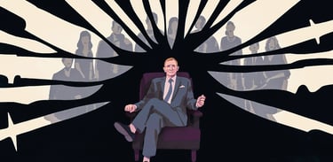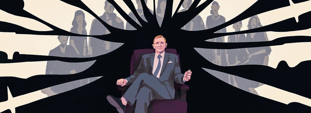 An illustration from the murder mystery fllm 'Knives Out', featuring the lead detective Benoit Blank (David Craig)