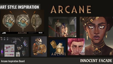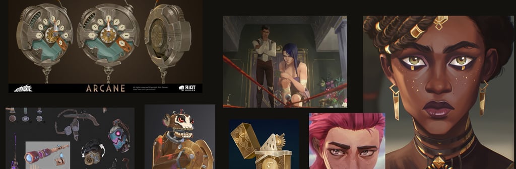 A art style inspiration moodboard depicting a collectioons of art screenshots showcasing Arcane's painterley and colourful style. (By Riot Games)