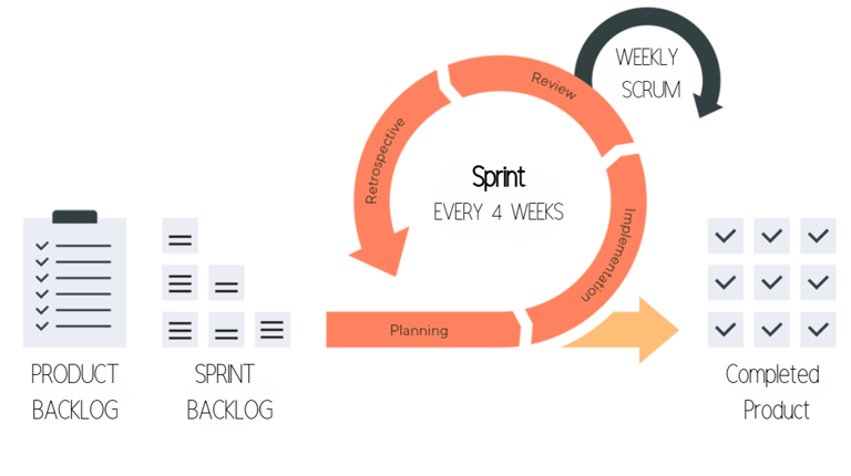 To simplify things a sprint is a period of time- for us it's four weeks. At the end of the sprint, we do testing both internally and externally to gather feedback. We come up with an actionable plan based off feedback provided that inform tasks. Within the 4 weeks between sprints, we have weekly scrum/stand-up meetings. A scrum/stand-up is a short, focused meeting where the department heads review progress, discuss any roadblocks, and plans the work for the upcoming week.