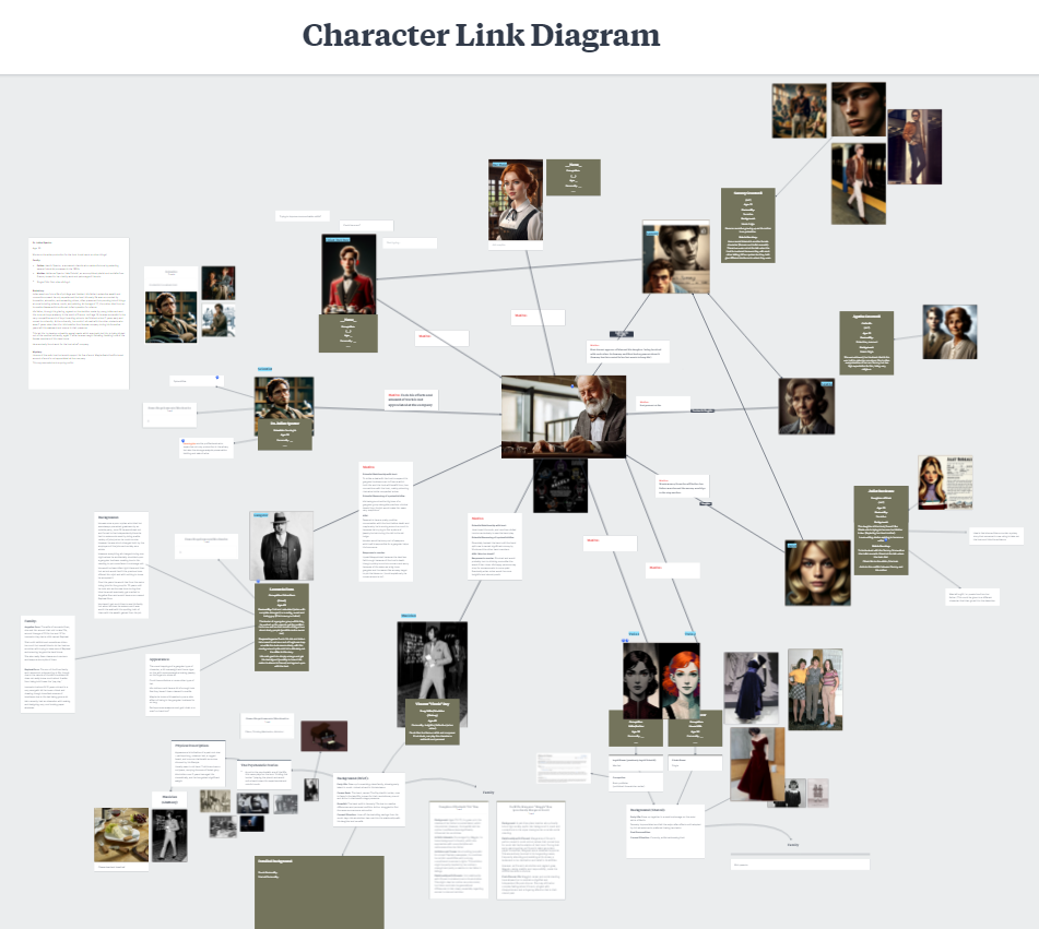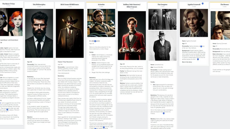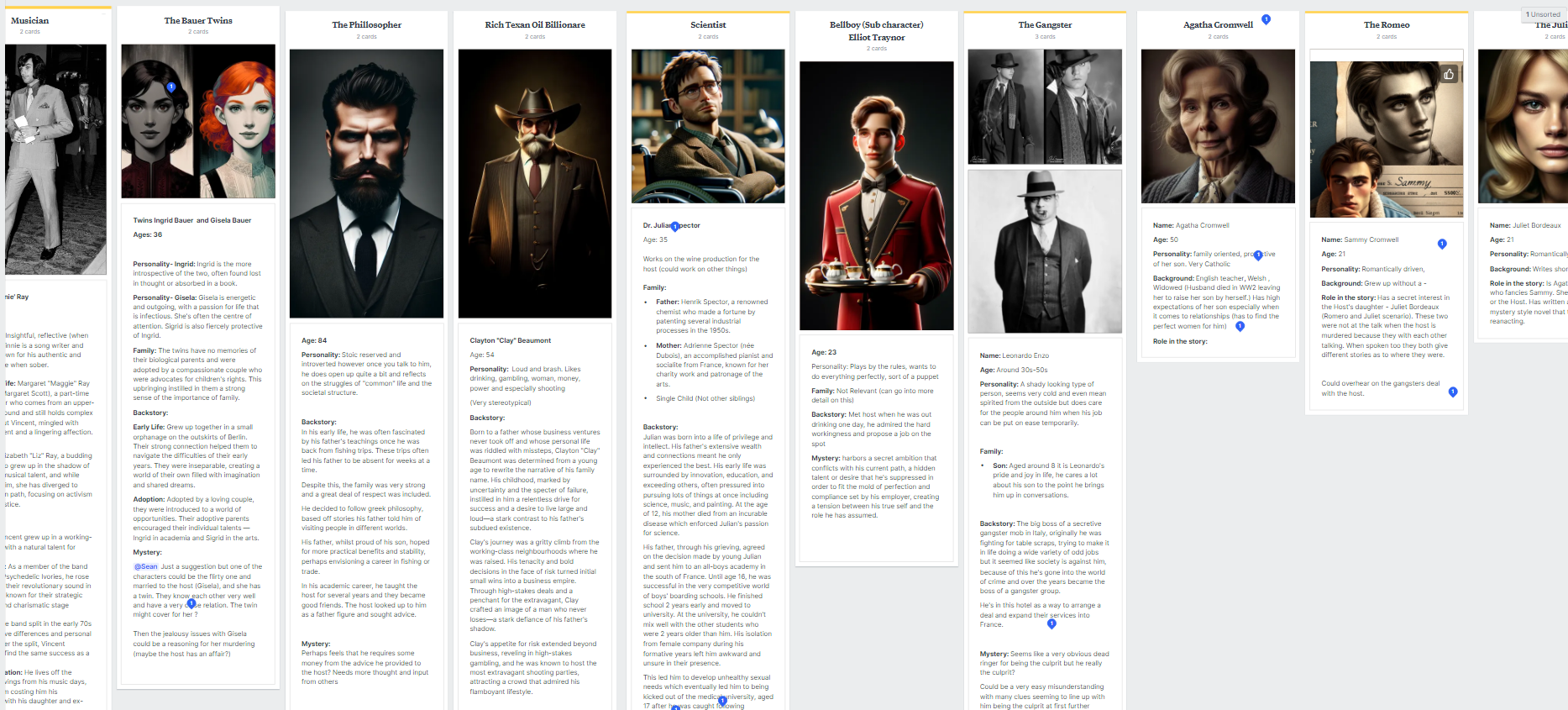 Our methodology began with highlighting which of these elements had the most impact and was most prominent in our game concept. We knew that we wanted a murder mystery, based in a closed environment, and set in the 1970s. These variables are heavily impacted by the characters in the scene, their dialogue and most importantly how they interact with the player and each other. From here we wanted to establish a long list of potential characters. Each member of the team designed 3-5 surface-level characters with some background. After narrowing these characters down, ideas and links began to form between characters making them work more cohesively. The overall goal within the characters is to complement each other’s roles within the grand story we wanted to tell.