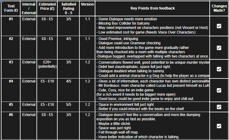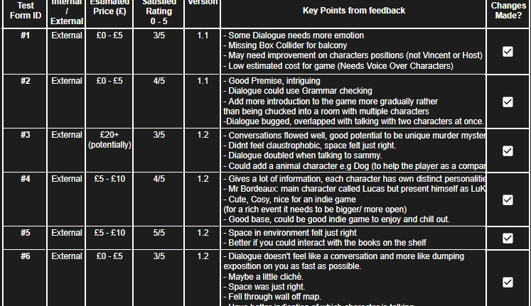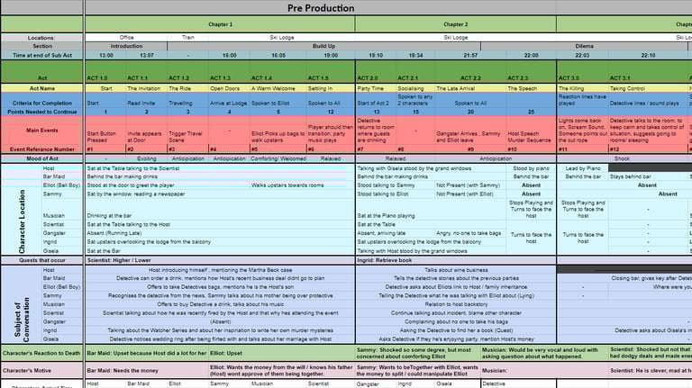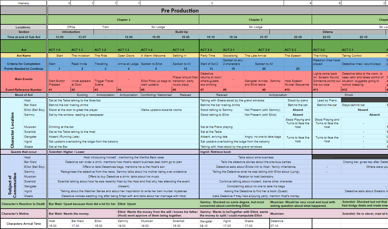 This spreadsheet was very effective at fulfilling its purpose of breaking down events, timings, mechanics, and dialogue topics. It also served to keep track of important details such as when each guest arrives at the Lodge, their motives and reaction to the murder. These details were vital to keep in mind and small details can go unnoticed which many players would find to break immersion or consistency.