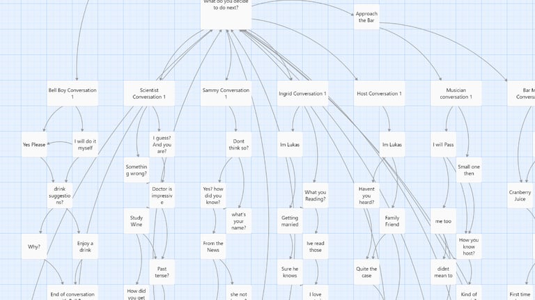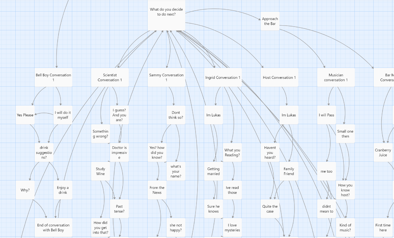 We designed a form of documentation that could keep every team member on the same page and understand the sequence of events throughout the story. The story was split into 5 distinct acts to maintain a steady momentum and tasks or quests were spread out to help break up the repetitive character interactions. This had a drastic positive effect, giving the story more meaningful dialogue and build-up to the murder.